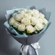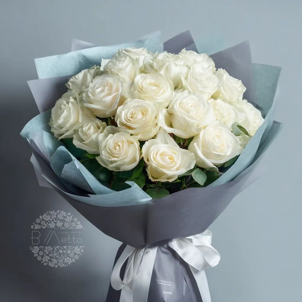 Лёгкий и воздушный букет с белыми розами, будто нарисован акварелью на снежном фоне. Прекрасный выбор для утончённых поздравлений и романтичных встреч. Белоснежные оттенки создают ощущение лёгкости и покоя.