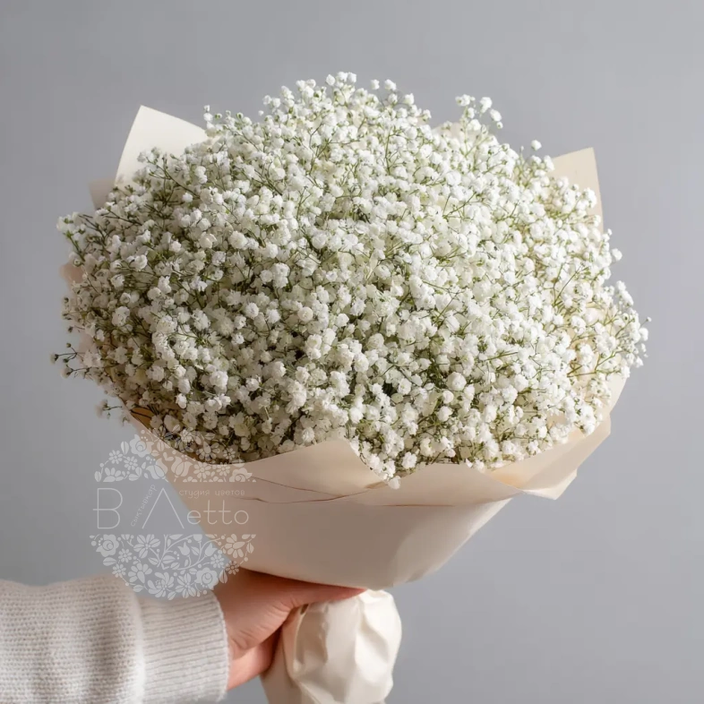 Лёгкий и изящный монобукет из белой гипсофилы — словно облако в руках. Подчёркивает чистоту чувств и гармонию. Отличный выбор для свадеб, фотосессий или подарка с минималистичной эстетикой.