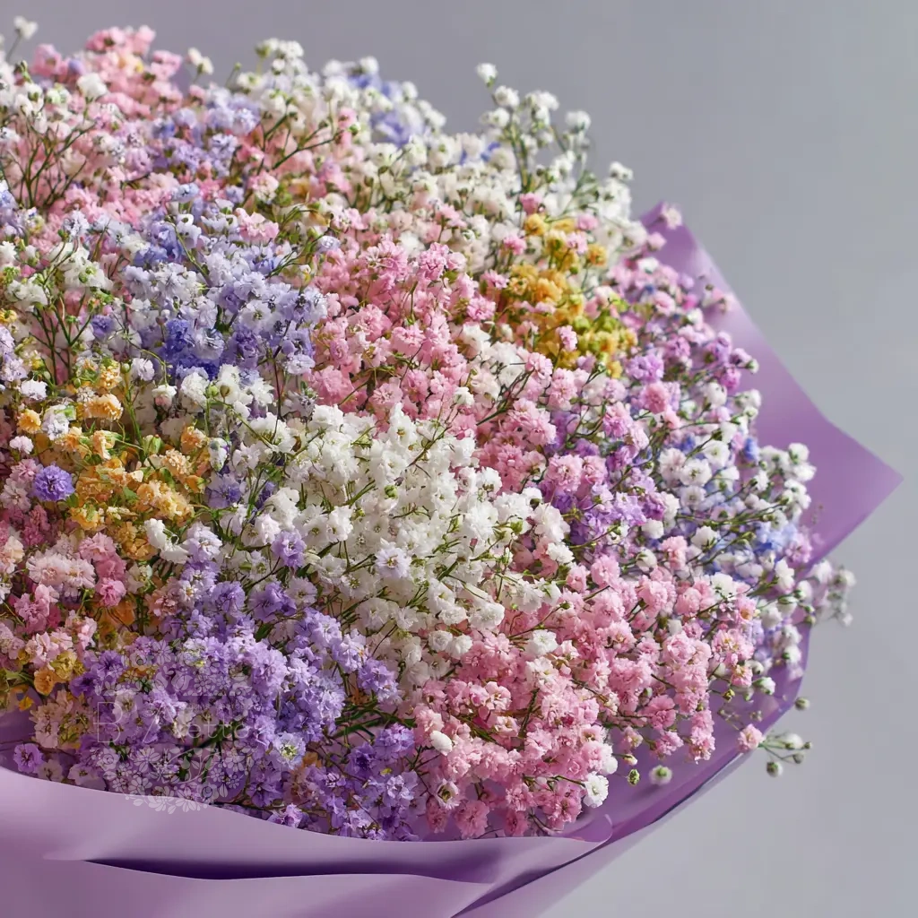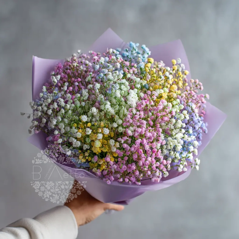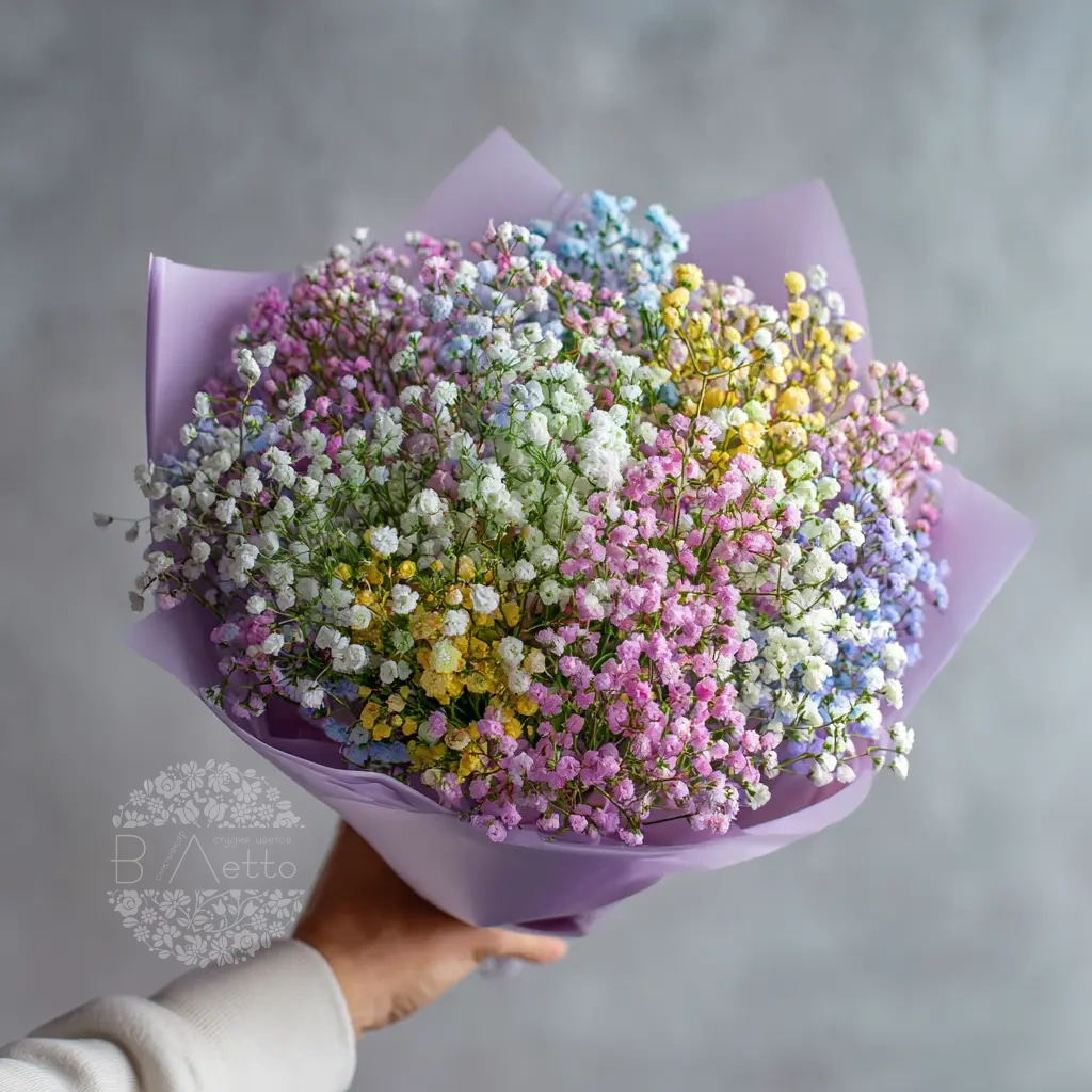 Богатая, объёмная структура создаёт ощущение цветочной волны. Гипсофила выглядит воздушно и динамично, а букет дарит настроение яркого торжества.