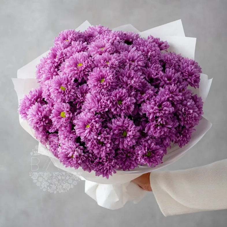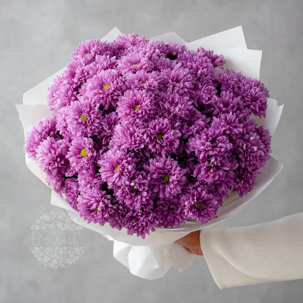 Нежность и загадочность — главные ноты этого букета. Сиреневые хризантемы подойдут для романтичного подарка, акцента на чувствах или комплимента с тонким намёком.