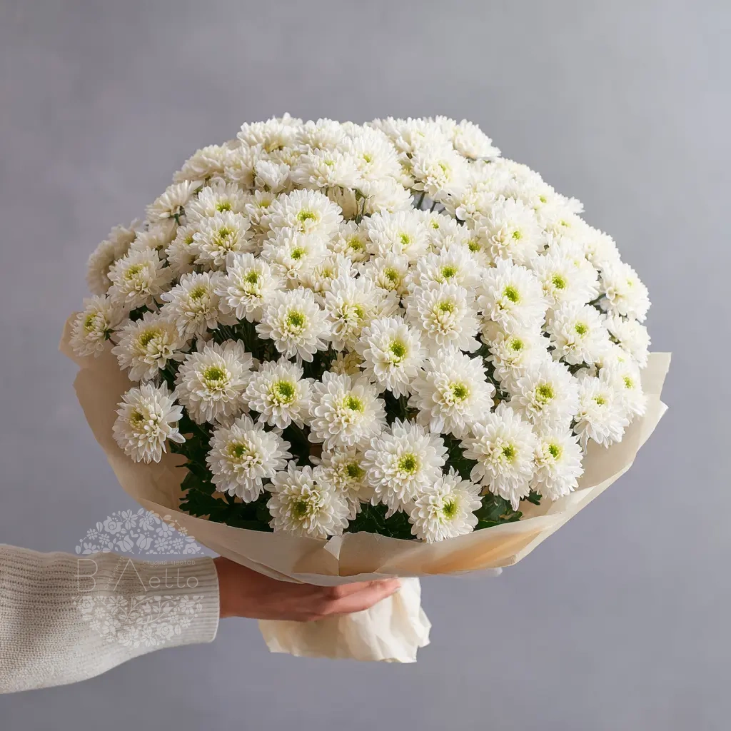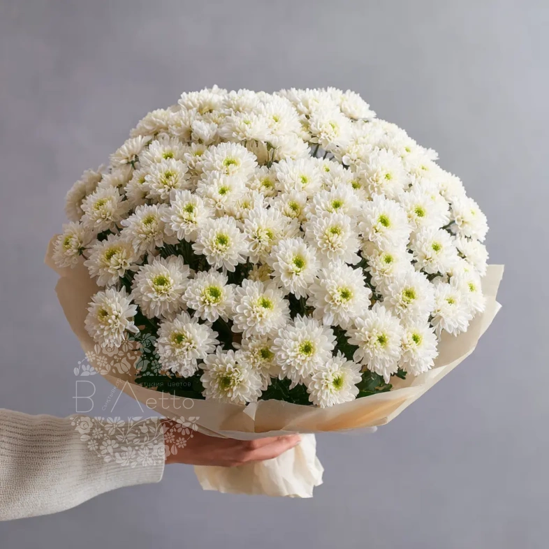Классический букет из белых кустовых хризантем. Подойдёт для офиса, поздравлений, свиданий и просто — чтобы сделать день ярче.