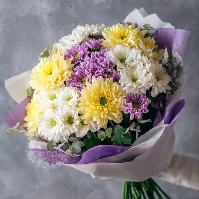 Нежный букет в пастельных сиреневых тонах с акцентами солнечного жёлтого и чистого белого. Создаёт ощущение лёгкости и утренней свежести. Отлично для подарка с романтическим подтекстом или в знак благодарности.