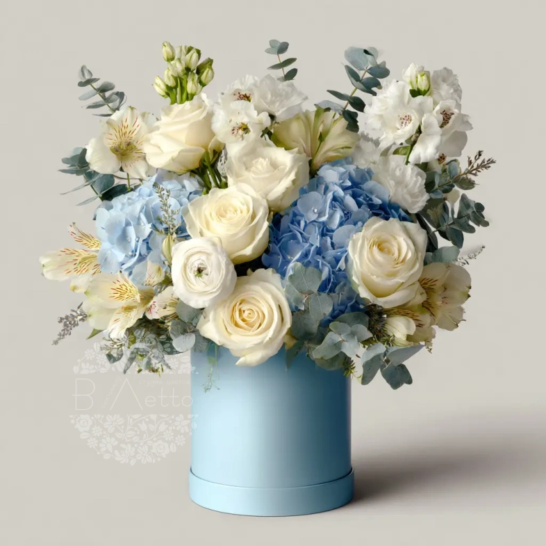 Белые розы, голубая гортензия и серебристый эвкалипт создают волшебную зимнюю атмосферу, наполняя дом теплом и уютом.