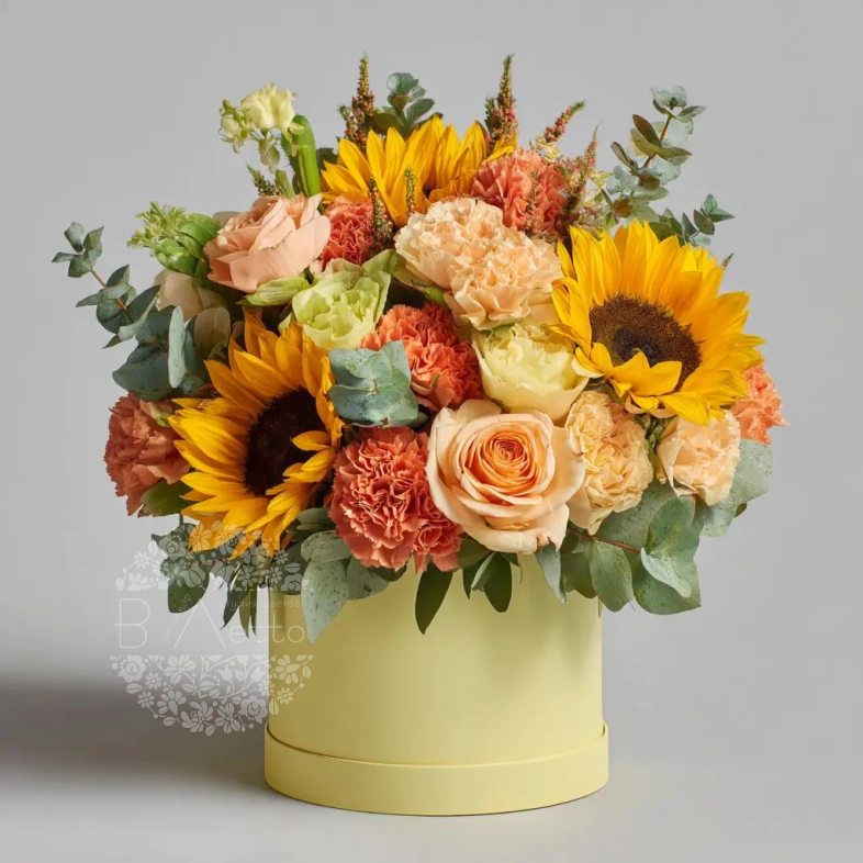 Подсолнухи, оранжевые гвоздики и кремовые розы — яркая палитра для теплых осенних дней.