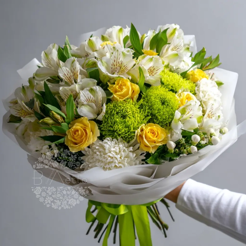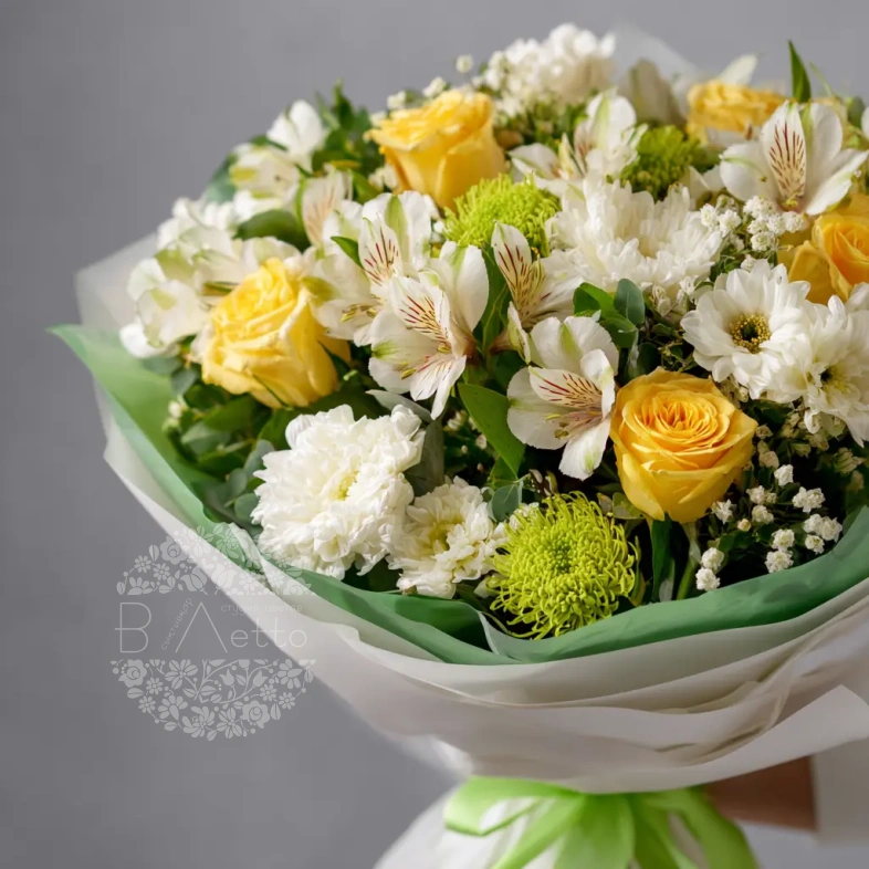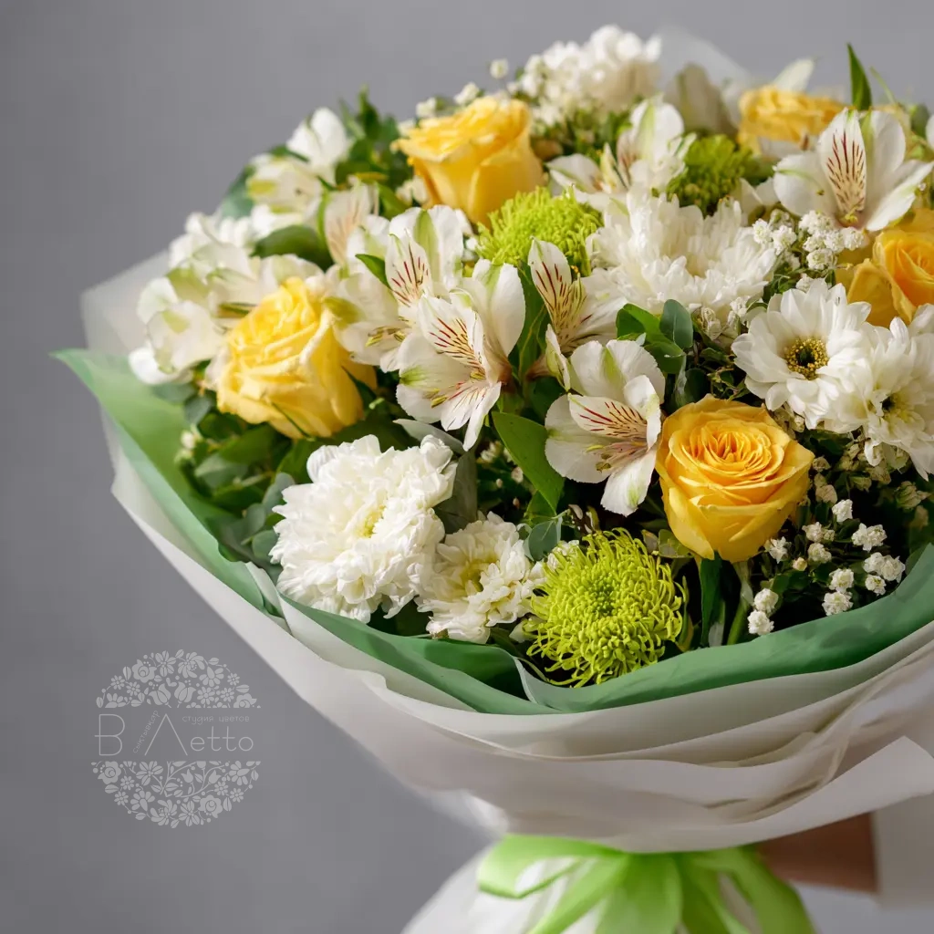 Композиция, как летняя песня — наполнена мягкими красками, теплом и светом. Альстромерии добавляют воздушности и утончённости. Универсальное решение для поздравления женщины или девушки.