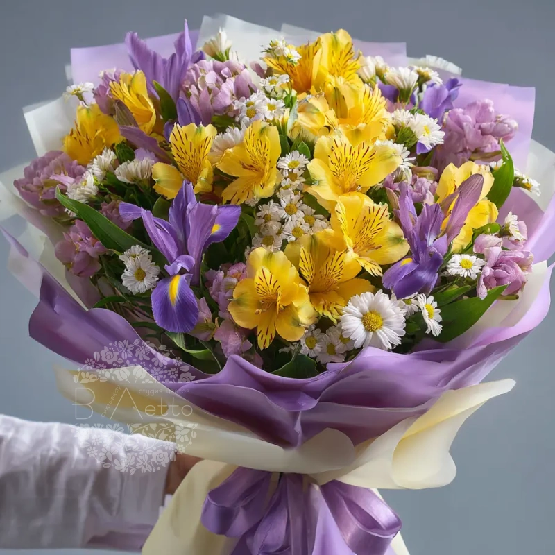 Композиция в жёлто-фиолетовой гамме — как всплеск света в пасмурный день. Альстромерии создают ощущение тепла и оптимизма. Прекрасно подойдёт для поднятия настроения или неожиданного подарка.