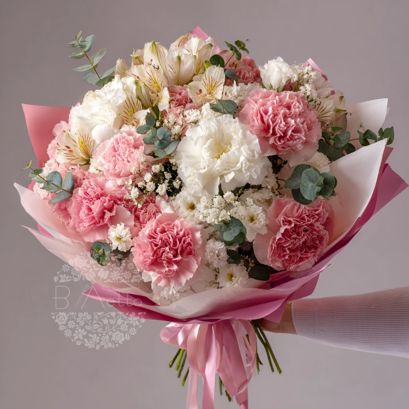 Нежность розовых гвоздик и свежесть зелени — гармония, которая покоряет с первого взгляда.