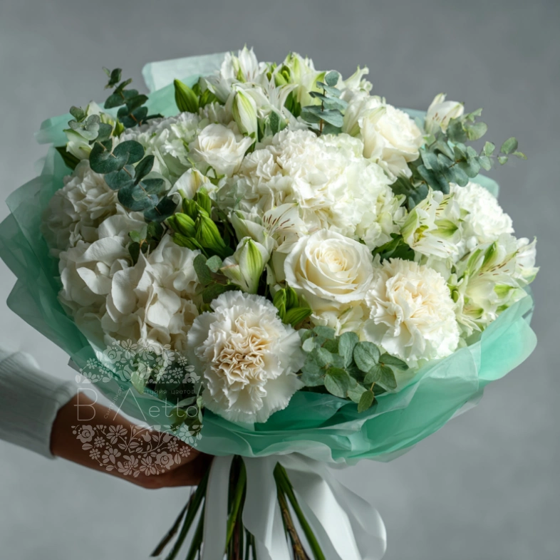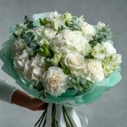 Лёгкий воздушный букет с нотками свежести создаёт ощущение прохлады. Отлично подойдёт для свадьбы, юбилея и дня рождения.