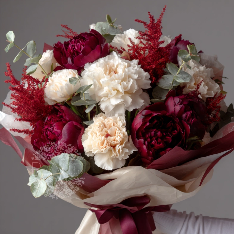ГлавнаяКаталогБукетыПионыБукет с пионами «Бархатный шелест»