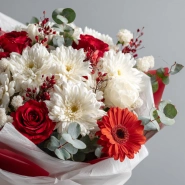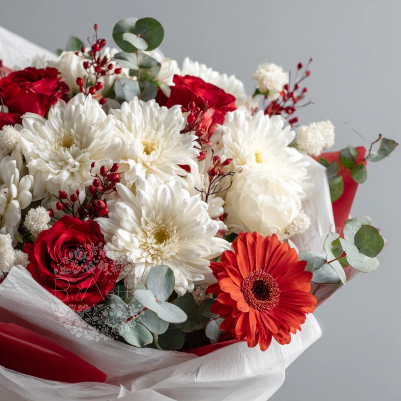 Собранный для торжеств и событий, этот букет наполнен яркими красками и хорошим настроением. Хризантемы долго сохраняют свежесть и эффектный вид, что делает их прекрасным выбором для праздника.