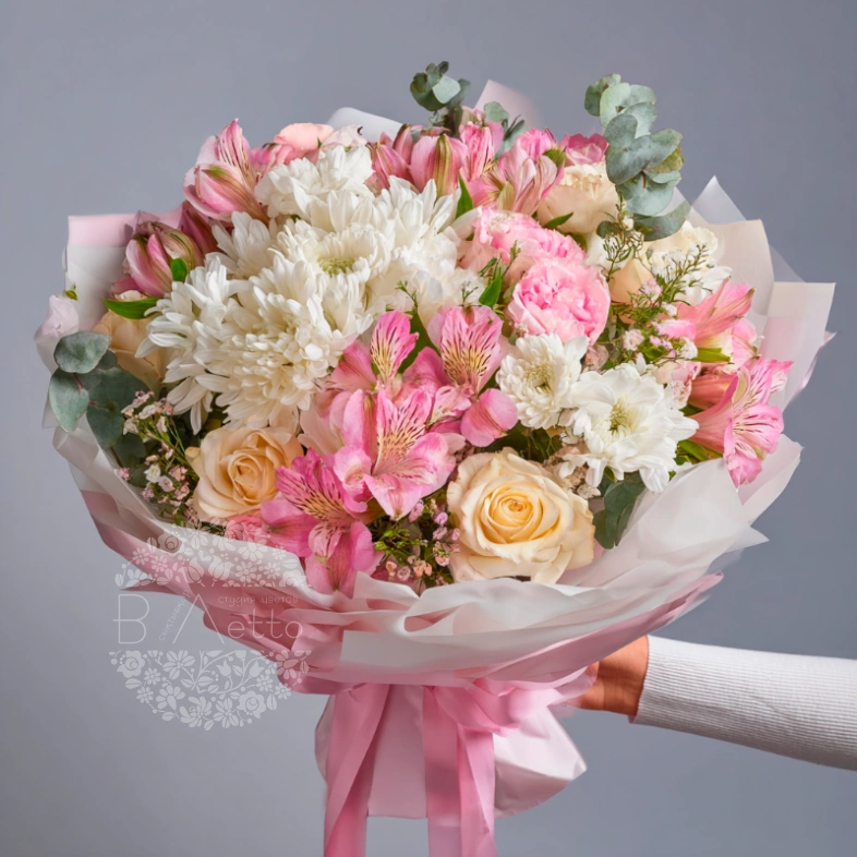 Сдержанная композиция в светлой гамме с белыми, кремовыми и розовыми оттенками. Хризантемы символизируют чистоту и уважение, а оформление делает букет универсальным для любого случая.