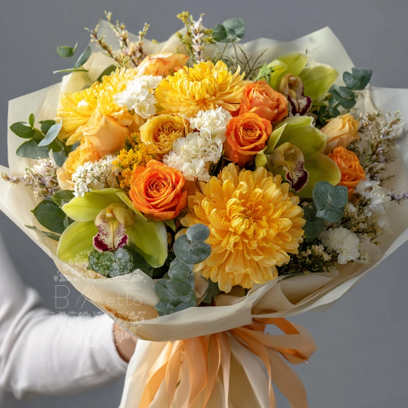 ГлавнаяКаталогБукетыХризантемыБукет с хризантемами «Классика тепла»
