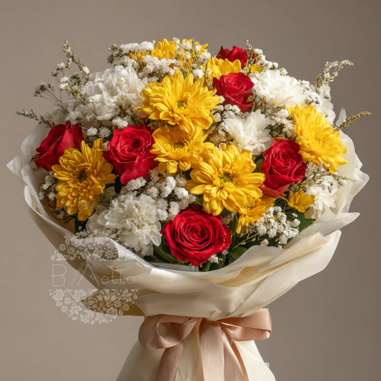 Букет, в котором встречаются солнечный свет и прохлада осени. Хризантемы подчёркивают тёплый посыл, а оформление делает его актуальным как для женщины, так и для мужчины.