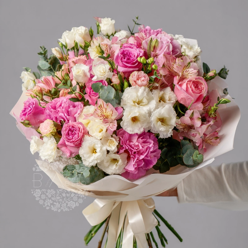 Светлая композиция, в которой раскрываются утренние оттенки розового и белого. Отличный подарок для женщин, ценящих утонченность.