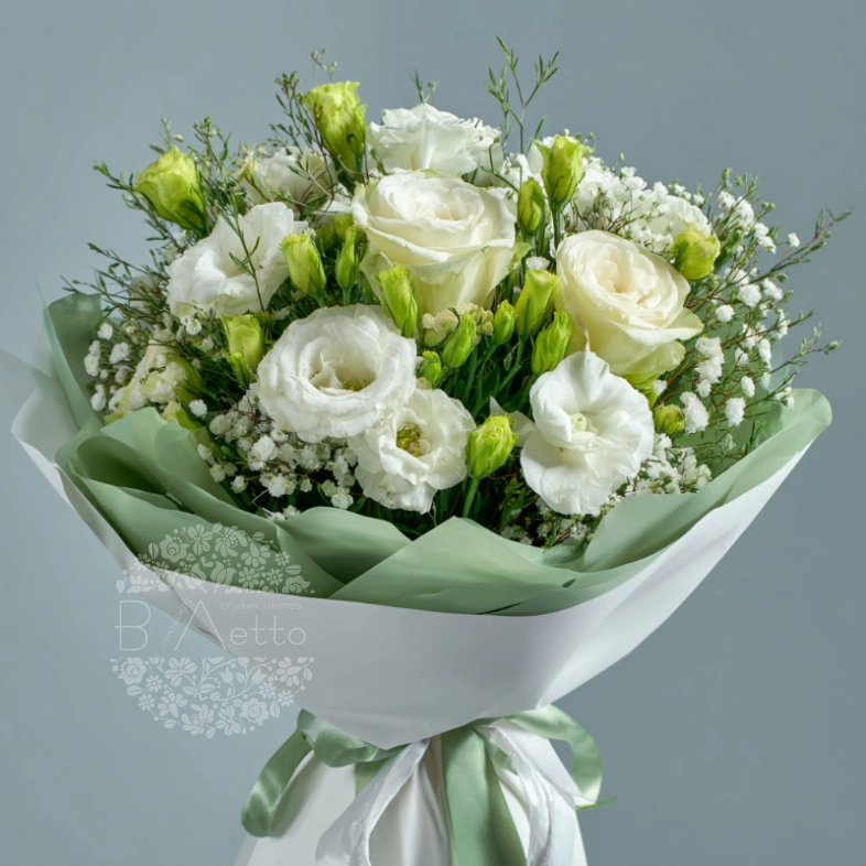 Белоснежная гамма и тонкие стебли — словно звон хрустального ветра. Эустомы придают композиции воздушность и элегантность. Букет, который говорит о любви, уважении и заботе.