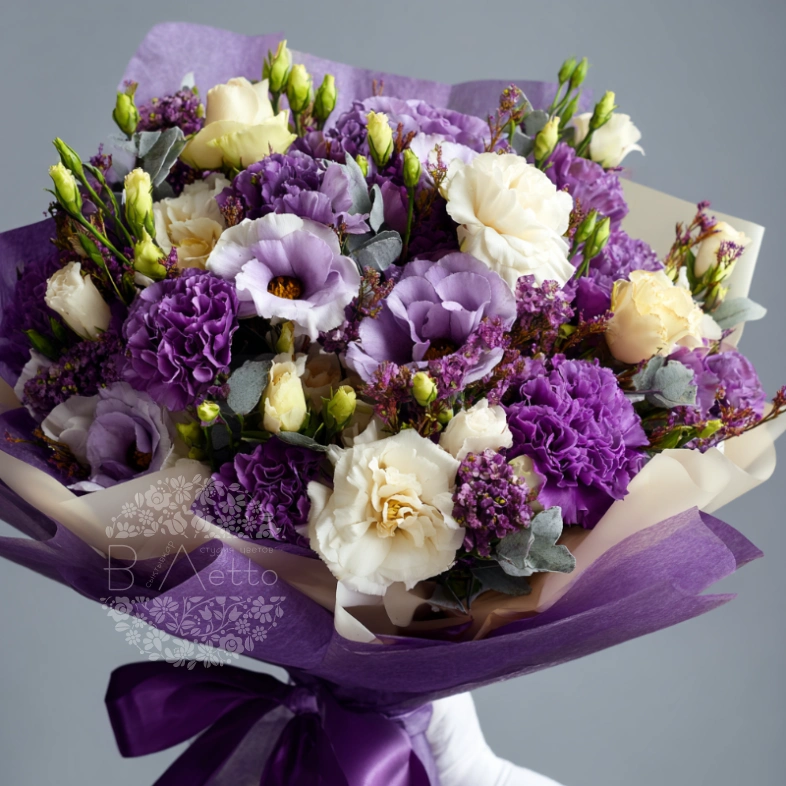 Лёгкий и воздушный букет, в котором переплетаются хрупкие эустомы и пышные гвоздики. Их сиреневые оттенки создают ощущение волшебства и нежности. Отличный выбор для признания в чувствах или создания праздничного настроения.