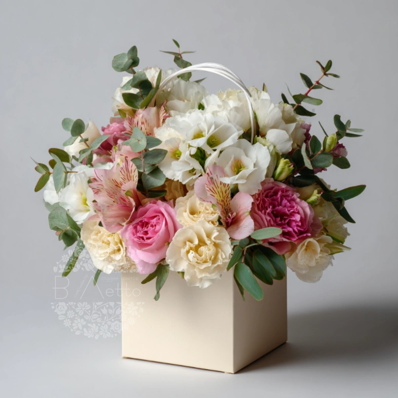 ГлавнаяКаталогКомпозицииВ сумочкахЦветы в сумочке «Прогулка по Парижу»