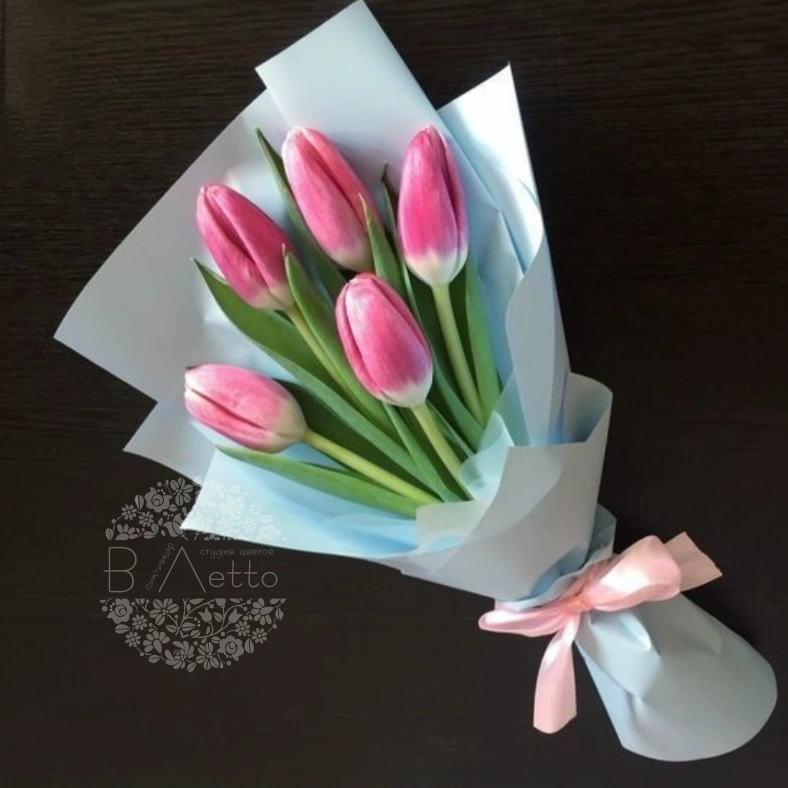 Букет из нежных розовых тюльпанов, завернутый в голубую бумагу и украшенный атласной лентой. Идеальный подарок для создания весеннего настроения.