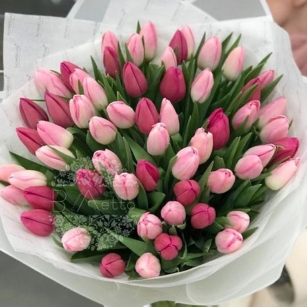 Букет из нежных тюльпанов с плавным переходом от светлых к глубоким розовым оттенкам. Неповторимая естественность и яркость делают этот букет идеальным выбором для любого торжества. Композиция излучает тепло и гармонию, наполняя пространство нежностью и свежестью весны.