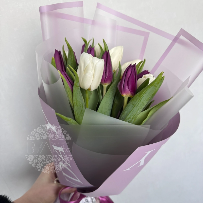 Букет из белых и фиолетовых тюльпанов, элегантно упакованный в лавандовую и белую бумагу с декоративной лентой. Контраст цветов и оформления придает композиции выразительность и делает ее идеальным выбором для любого торжества. Этот букет символизирует элегантность, нежность и глубокие чувства.