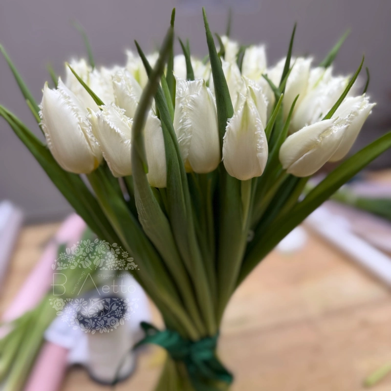 Букет, состоящий из нежных белых тюльпанов с изящными бахромчатыми лепестками, перевязан зеленой лентой. Необычная форма цветов придает композиции элегантность и воздушность, а насыщенная зелень листьев подчеркивает их безупречную белизну. Этот сдержанный и в то же время эффектный букет станет прекрасным выражением светлых чувств и эмоций.