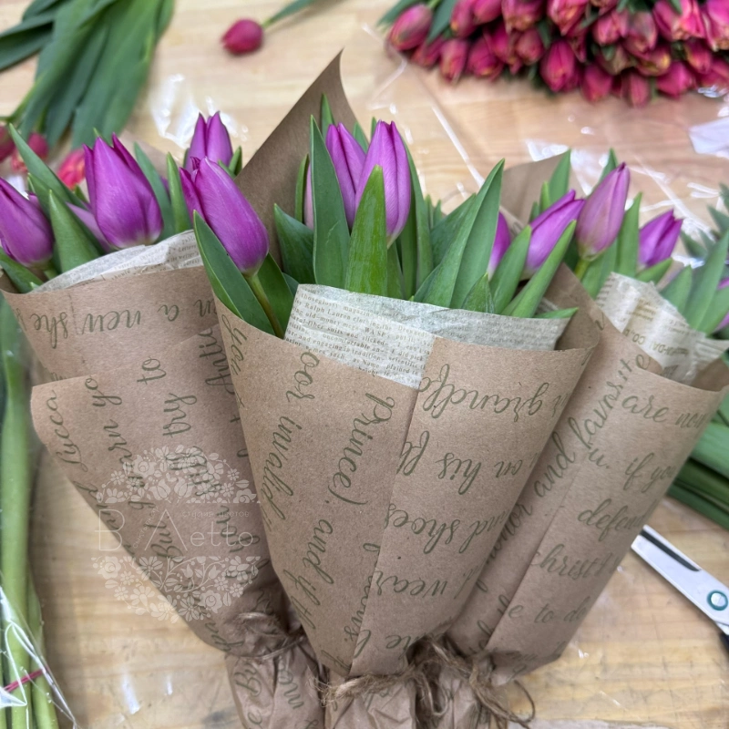 Элегантный букет из фиолетовых тюльпанов, завернутый в бумагу с трогательной надписью, создает трогательный и стильный подарок. Нежные лепестки тюльпанов и сдержанная упаковка придают букету особую прелесть, делая его прекрасным выражением внимания и заботы.