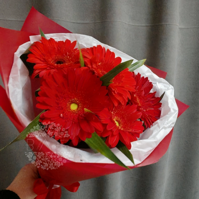 Букет из ярких красных гербер, элегантно упакованный в красную и белую бумагу. Этот выразительный букет станет прекрасным подарком для близких и друзей. Герберы символизируют радость и уверенность, наполняя пространство теплом и светом.