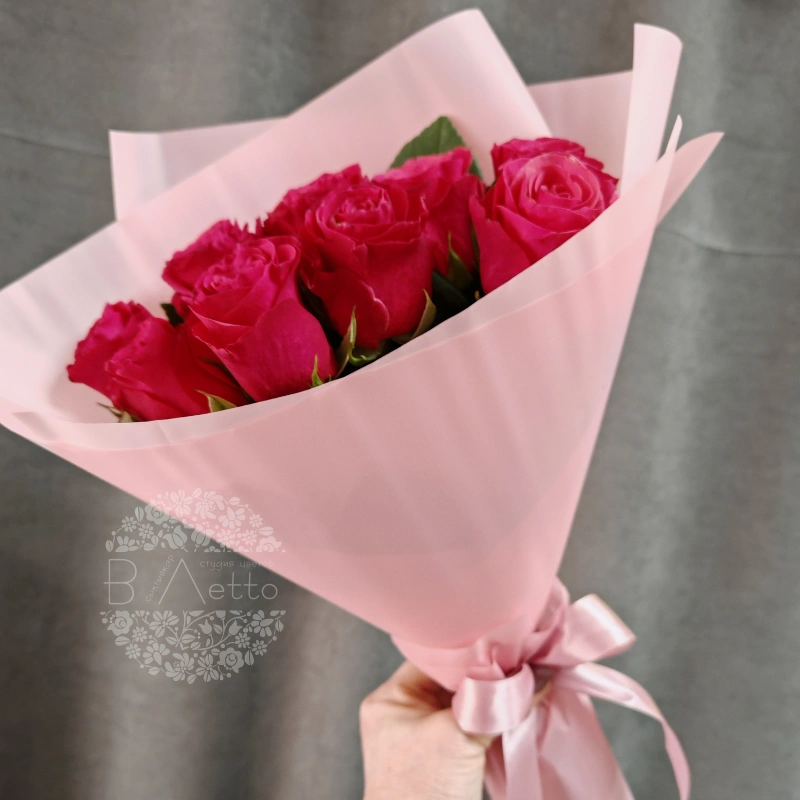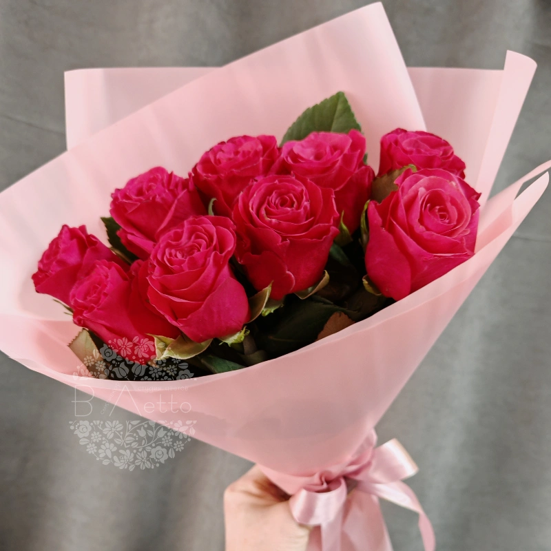 Букет из 9 свежих роз глубокого малинового цвета, элегантно завёрнутый в светло-розовую бумагу и перевязанный атласной лентой, создаёт яркий и романтичный образ. Насыщенный цвет бутонов и нежная упаковка придают композиции особую выразительность и изящество. Этот букет станет прекрасным подарком для самых дорогих и близких людей.