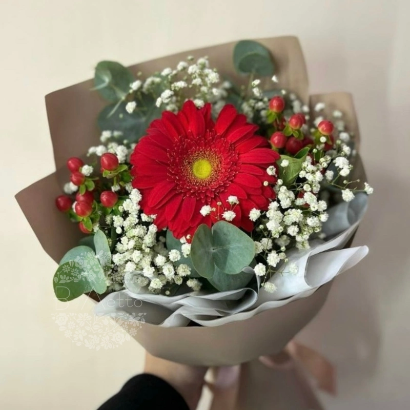 Букет, воплощающий страсть и нежность, состоит из крупной красной герберы, окружённой воздушной гипсофилой и дополненной ягодами гиперкума. Композиция элегантно оформлена в бежево-белую упаковку с бантом и дополнена зеленью эвкалипта.