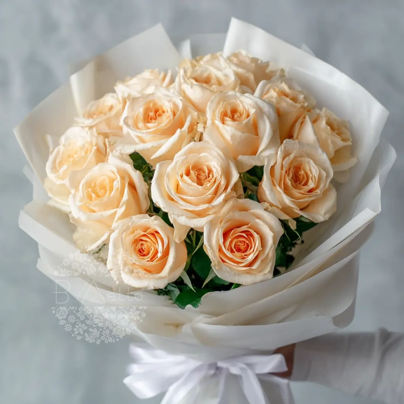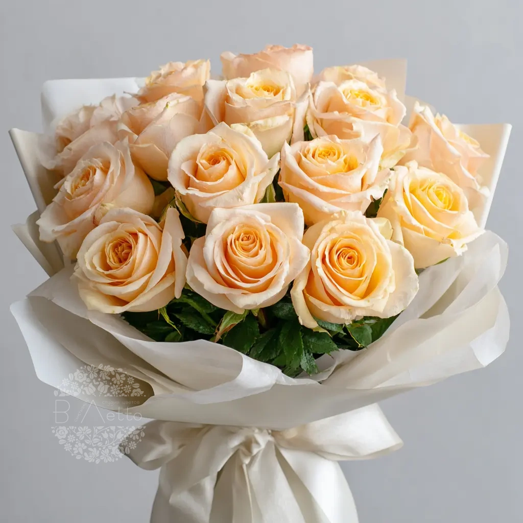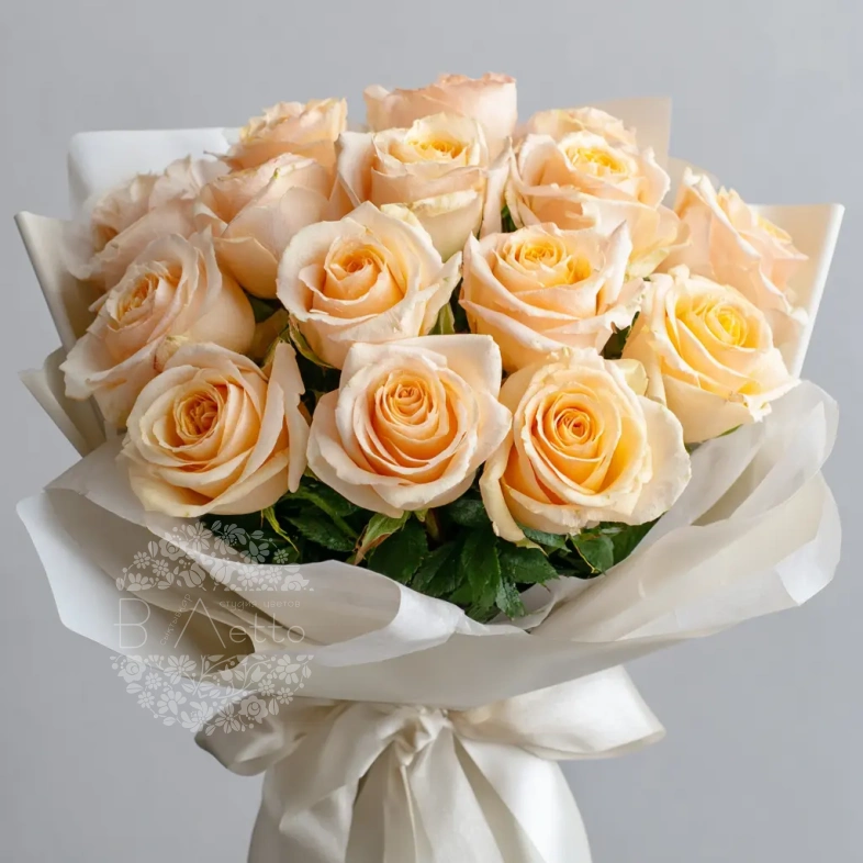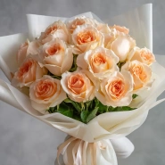 Мягкий, пастельный букет из 15 персиковых эквадорских роз подойдёт для изысканного подарка на день рождения, юбилей или свадебную годовщину. Персиковый цвет — символ благодарности и тёплого отношения.