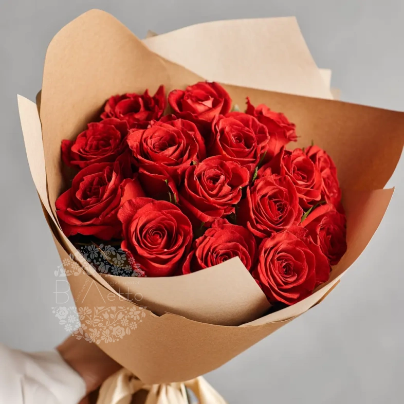 Компактный, но выразительный букет с 15 алыми розами из Кении. Их бархатистые бутоны и насыщенный оттенок делают букет запоминающимся акцентом на любом празднике.
