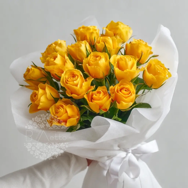 Яркий, солнечный букет из 15 жёлтых роз длиной 40 см. Символ радости, дружбы и позитива. Кенийские розы в этом исполнении станут отличным подарком коллеге, подруге или близкому человеку.